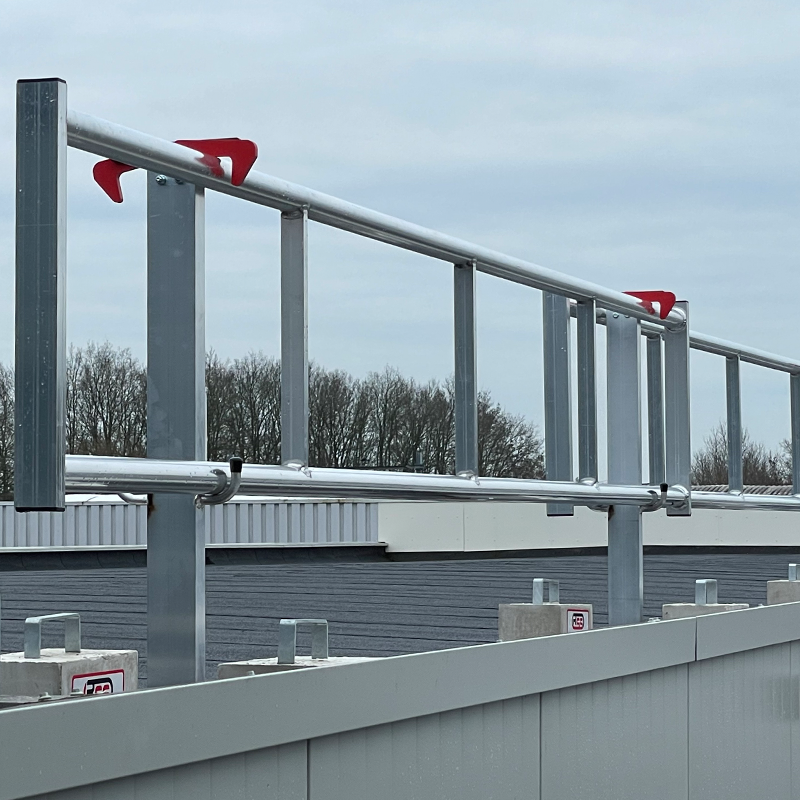 En résumé, le RSS Kompakt est une solution pratique de protection temporaire contre les chutes, spécialement conçue pour les toits plats. La combinaison d'une rampe de protection contre les chutes, de blocs de béton et d'un cadre de transport offre un moyen sûr d'assurer une protection temporaire sur les toits plats et répond aux normes de sécurité applicables.