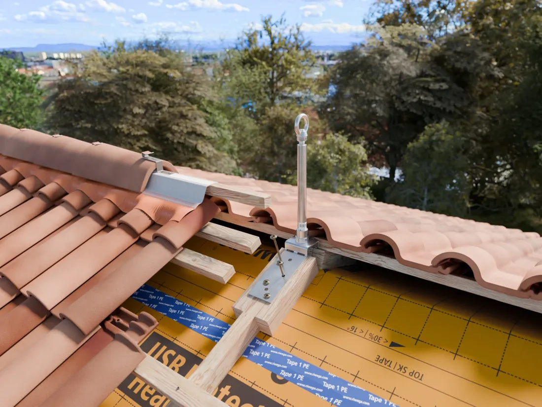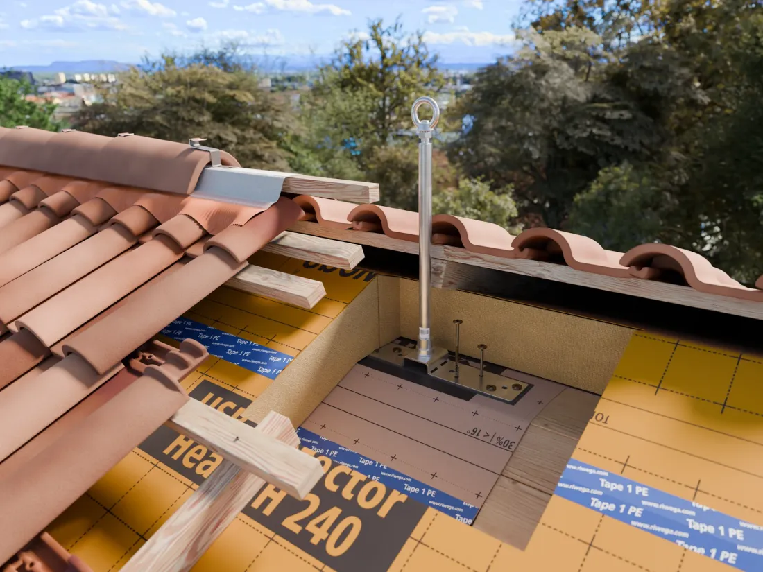 Il SafeGuard AP 7 Ø 26 mm è un versatile punto di ancoraggio adatto a un'ampia gamma di tipi di coperture, tra cui tetti piani, tetti inclinati, tetti a falda e tetti industriali. È approvato per l'installazione su sottofondi in calcestruzzo (minimo C20/25 secondo DIN EN 206-1) e su solai in legno massiccio e costruzioni in legno portanti secondo DIN 1052.